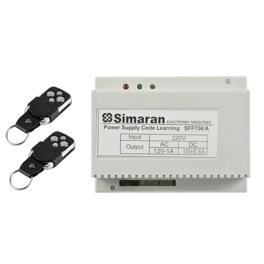 تغذیه ریموت کنترل سیماران مدل SFF706/A می تواند به جای منبع تغذیه اصلی بر روی آیفون تصویری ویا صوتی نصب شود و شما می توانید از فاصله 30 متری قفل درب خود را باز نمایید. تغذیه ریموت کنترل سیماران مدل SFF706/A از نظر کارایی و نصب آسان بسیار مناسب و مقرون به صرفه است ،این تغذیه دارای دو عدد ریموت کنترل جهت باز کردن درب می باشد. این محصول دارای خروجی 12 ولت dc و ac است. همچنین ریموت های ترانس دربازکن ریموتی سیماران قابلیت ست شدن با درب های پارکینگی مختلف را دارد و شما نیاز به حمل ریموت های متعدد نخواهید داشت. فرکانس کاری ریموت های این محصول 433 مگاهرتز میباشد.